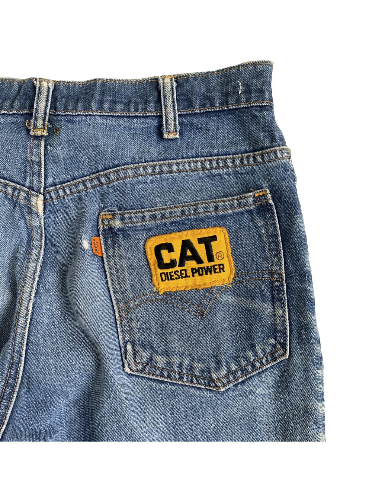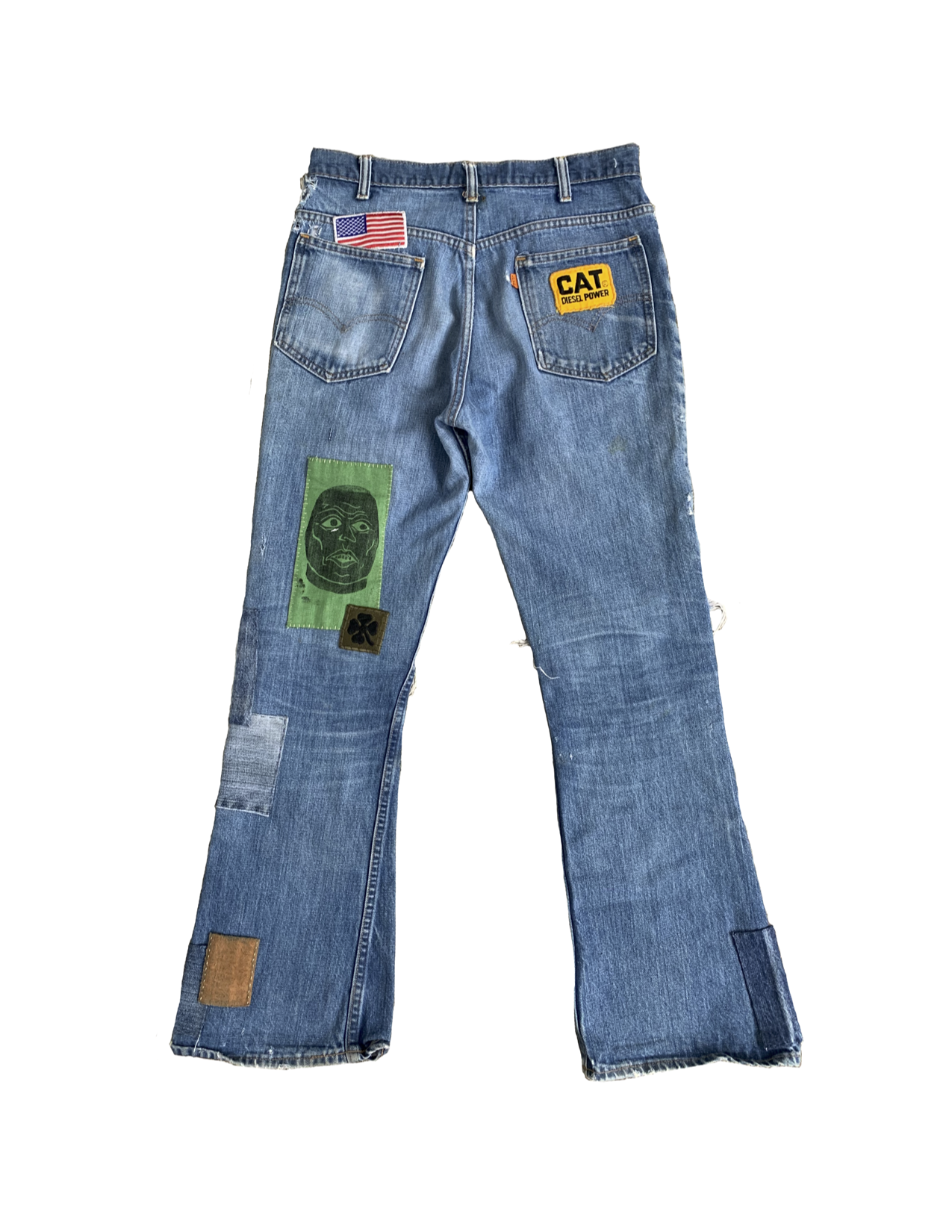 70's orange tab flare jeans embellished with several repairs and riddled with embroidered patches dating from the 60s-80s. Double pockets for more space for Mary Jane. All embroidered patches are hand-stitched, all repairs are hand stitched as well.
